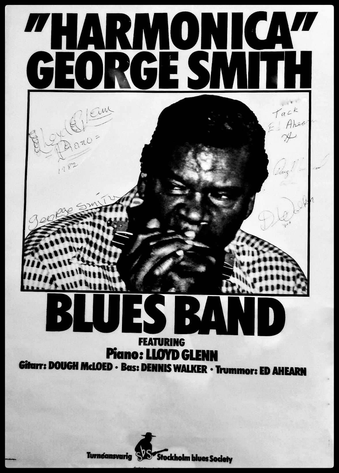 Here is a tour poster for “Harmonica“ George Smith designed by the Stockholm Blues Society. I assume that SBS had arranged a tour and created these posters for on site advertising. The poster is signed by George and the rest of the band. This poster comes courtesy Egidio Juke Ingala.