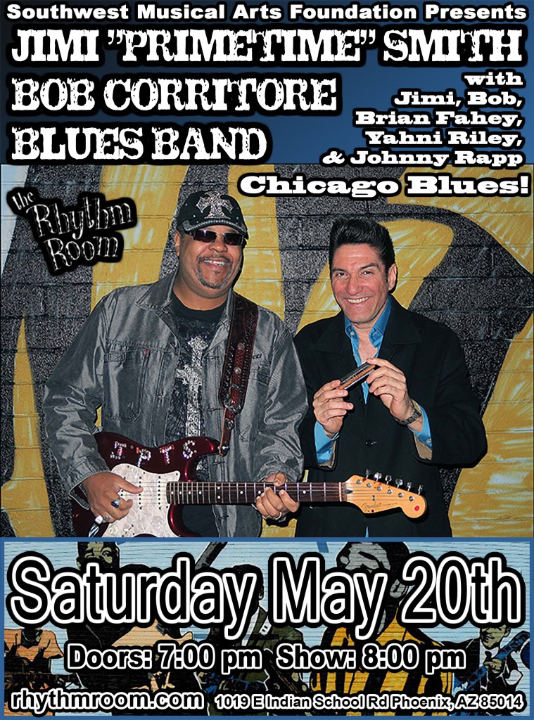 Minford James Smith, better known as Jimi Primetime Smith is a fine vocalist and a true master of blues guitar! Primetime was born in Chicago on March 12, 1958. He is the son of Johnnie Mae Dunson, a great songwriter, drummer, and singer steeped in the thick of Chicago blues in its heyday. While growing up his mother would have dinner guests such as Willie Dixon, Eddie Taylor, Koko Taylor, Hubert Sumlin, J.B. Hutto and many more. Jimmy Reed stayed with the Smith family for a period of time and was the first person to teach Primetime how to play guitar. Jimi Primetime Smith first gig was backing Jimmy Reed at the 1973 Ann Arbor Blues & Jazz Festival. Primetime would move to Minneapolis in the late 1970s and become an important part of that blues scene until he relocated to Phoenix in 2016. Since landing in Phoenix, Primetime and Bob Corritore have been closely collaborating. Jimi Primetime Smith has raised the bar in the Phoenix blues scene since his arrival.