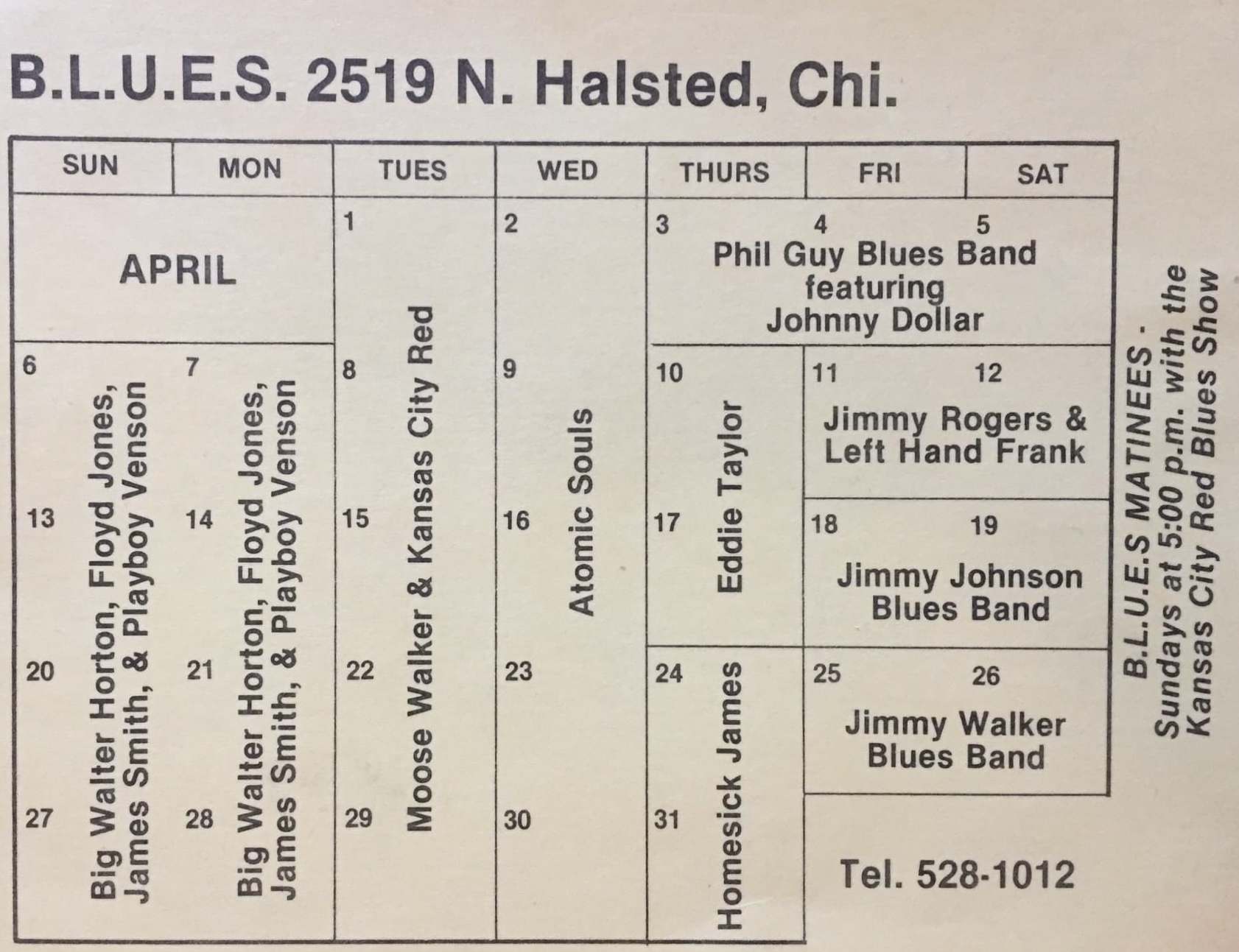 Blues on Halsted schedule card. Back then Jimi Primetime Smith went under the name of James Smith. Jimi held down a regular Sunday and Monday night gig playing guitar behind Big Walter Horton.