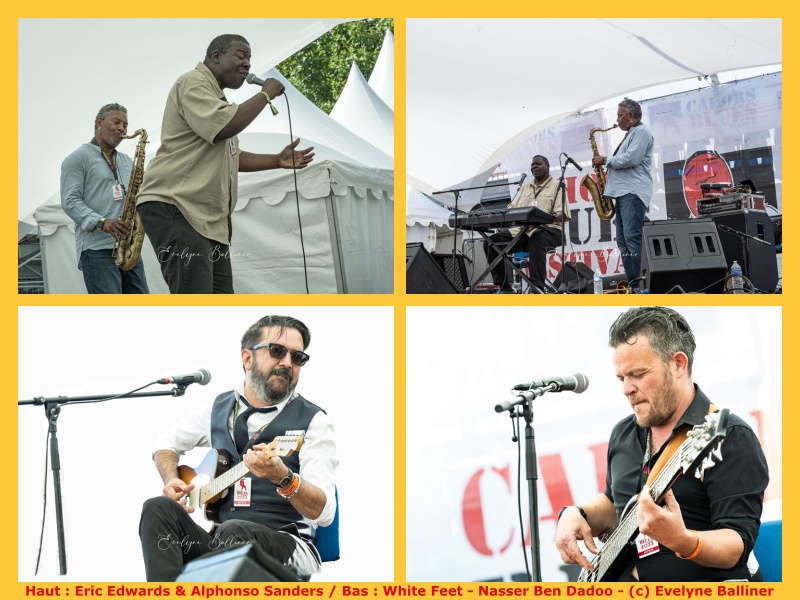 Une nuit réparatrice et nous revoilà déjà devant la scène Johnny Winter pour y découvrir un ovni qui nous vient d’Indianola, Eric Edwards qui, accompagné d’Alphonso Sanders aux cuivres et à la flûte, va venir nous interpréter les standards du blues sur fond de programmations sur lesquelles l’artiste joue du piano et donne de la voix de fort belle manière. Viendront ensuite Nasser Ben Dadoo et Matthieu Tomi, le fameux duo White Feet qui a été finaliste à Memphis en janvier dernier lors de l’International Blues Challenge et qui nous offrira, à l’heure de l’apéritif, une prestation pleine de blues, celui d’ici et celui du Maghreb, avec énormément de charisme et de très bonne humeur. Un des grands moments du festival qui confirme tout le bien que l’on avait pu penser des White Feet lors de leurs diverses prestations à Memphis !