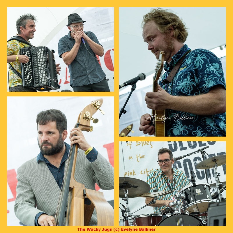 Jamais fatigué, c’est le même Eric Edwards qui ouvrira la scène Johnny Winter le lendemain après-midi avant que des extraterrestres se posent dans la cité cadurcienne … Fraichement débarqués de leur Bretagne où ils jouaient la veille aux Vieilles Charrues, excusez du peu, The Wacky Jugs sont en ville et ils vont le faire savoir en déversant sur la foule un blues qui n’appartient qu’à eux, mélange des relents de Sleepy John Estes, du Memphis Jug Band et de tout ce qui passe par la tête de leur charismatique leader, l’incroyable Jack Titley. Habitués à se produire dans les bars de Bretagne, The Wacky Jugs ont fait le voyage vers Memphis en mai 2022 et en sont revenus avec en poche le 1er prix de l’International Blues Challenge, devenant le premier groupe non-américain à gagner cette inaccessible finale en trente-sept ans … Et si le groupe a depuis participé à la Legendary Blues Cruise en compagnie du gratin de la scène blues mondiale, à des festivals prestigieux en France mais aussi en Suisse et en Croatie, il n’en reste pas moins motivé, humble et efficace et continue à se produire dans les bars, car ce sont là que sont ses racines et son ADN. Epuisée par quelques semaines de route à n’en plus finir, cette formation avec mandoline, accordéon, contrebasse, harmonica et batterie aura une fois encore tout donné pour le plus grand plaisir d’un public qui a adoré !