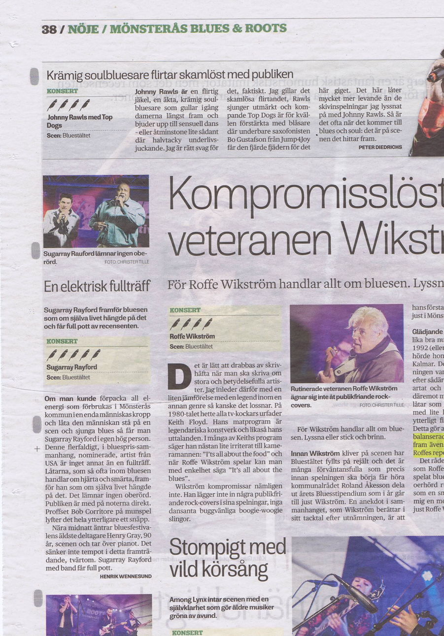 If you could pack al electrical energy consumed in Mönsterås into one person’s body and let that man be on a stage and perform blues, you would get Sugaray Rayford. This multiiple nominated artist from The USA is an absoulute bull’s-eye. Blues songs are often about heart and pain, and Sugaray performs them as if his life was depending on it..This leaves no one untouched. The audience loves it from the beginning. The pro Bob Corritore on harmonica, takes it to even a higher level. Close to midnight the festivals oldest participant appears, Henry Gray 90, Joins the band on stage to play piano. This brings the music up to an even further level. Sugaray Rayford and his band get the highest points.