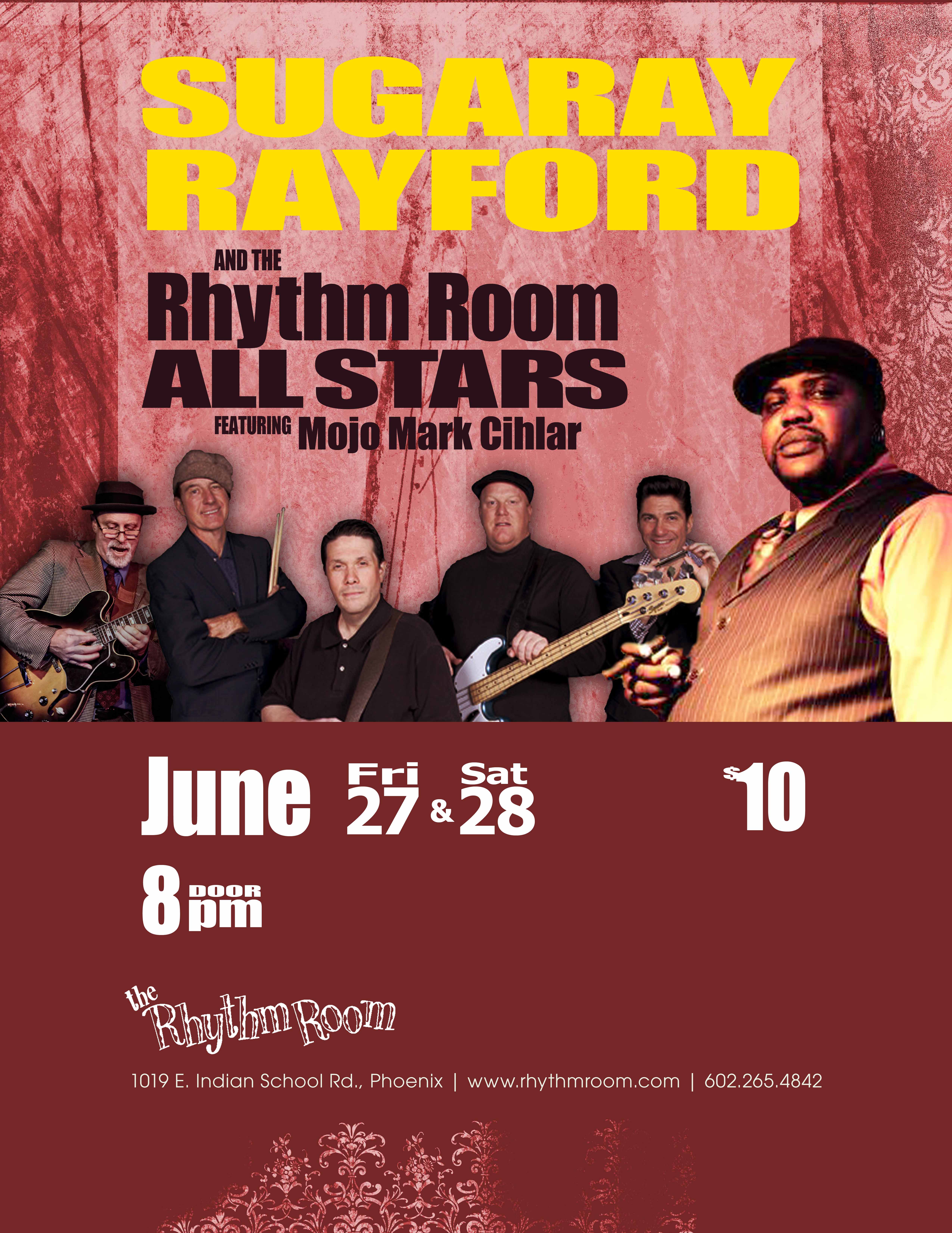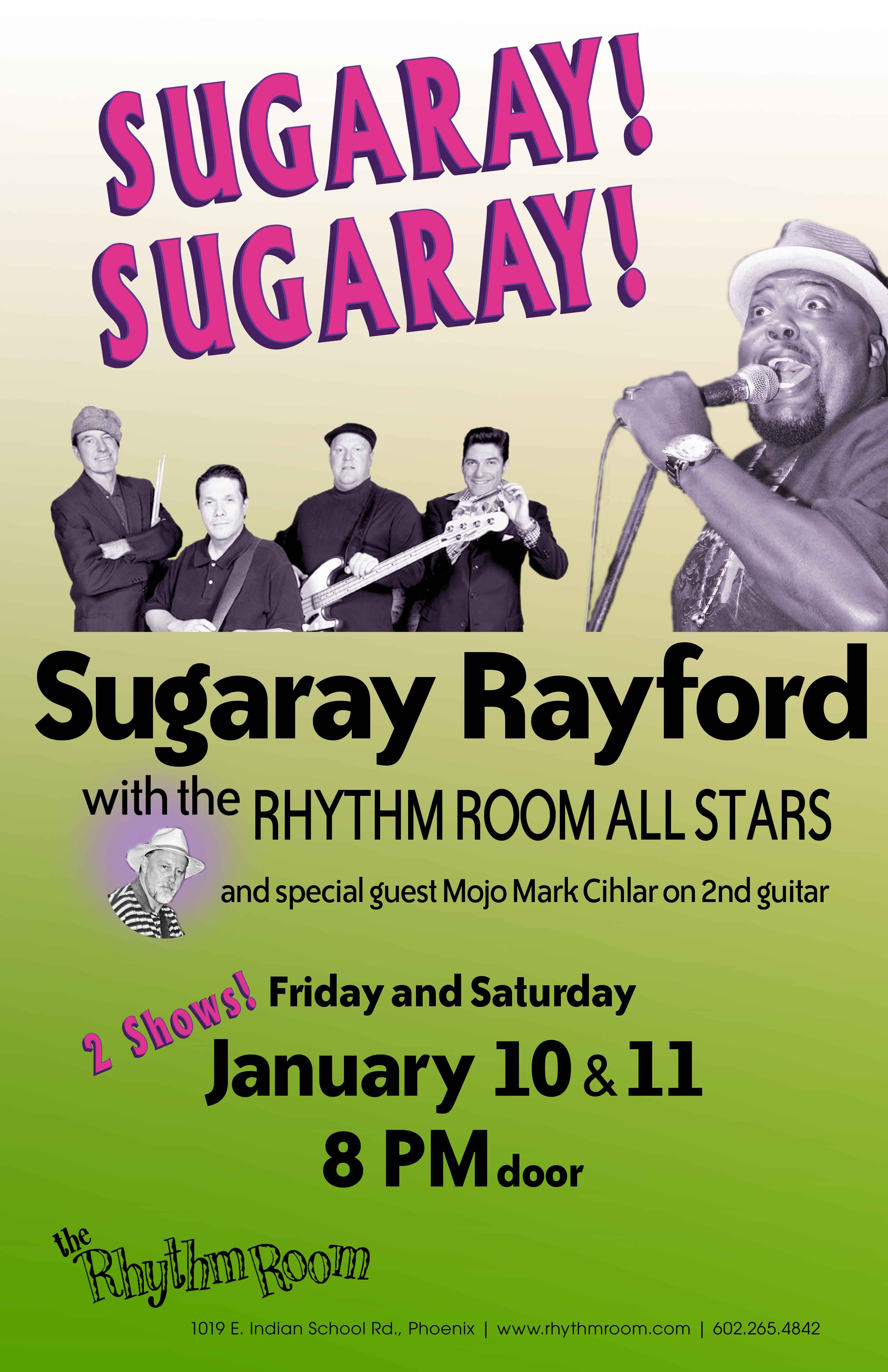 - Sugaray Rayford & The Rhythm Room All-Stars appear in Phoenix this weekend! The hard hitting combination of Sugaray Rayford & The Rhythm Room All-Stars will rock the blues Friday & Saturday, March 14 & 15 at The Rhythm Room, 1019 E. Indian School Rd. Phoenix, AZ 85014. Sugaray Rayford now resides in Phoenix and has paired up the RRAS for special hometown shows when home from his long bouts of touring. The stellar lineup includes Sugaray Rayford, Bob Corritore, Chris James, Patrick Rynn, Brian Fahey and very special guest Mojo Mark Cihlar (from Chicago). To see the poster for this event click here.