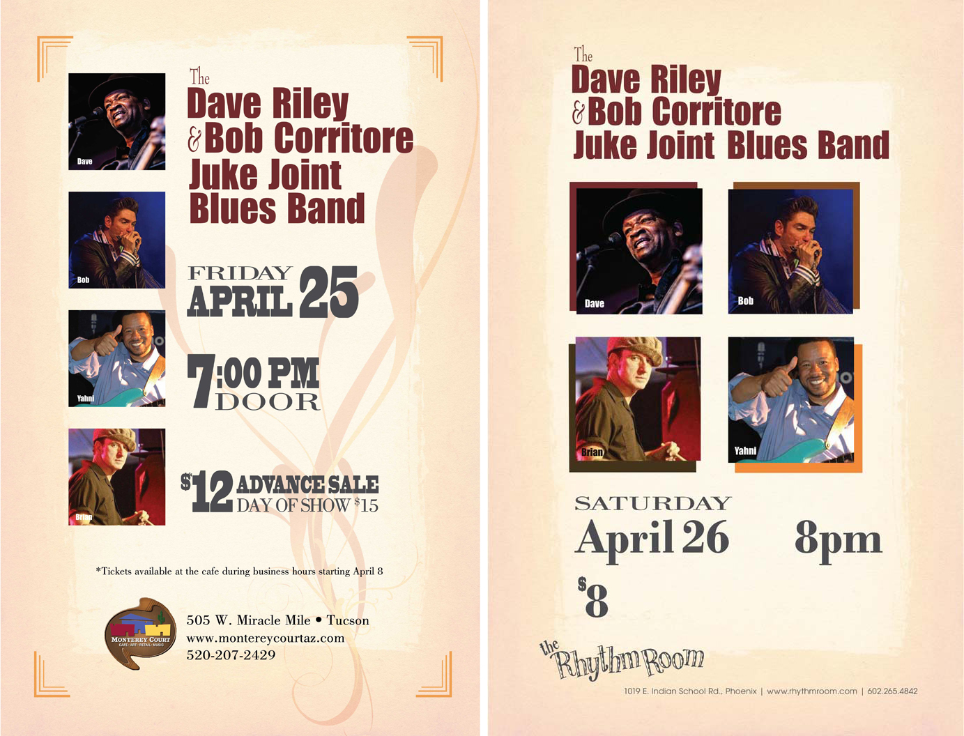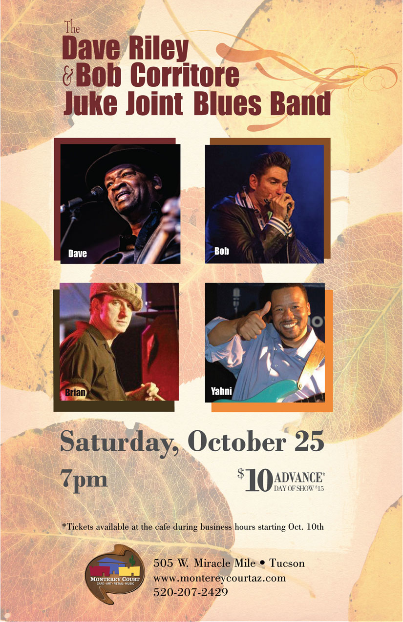 Dave Riley / Bob Corritore play Saturday at Monterey Court in Tucson! Look out Tucson, ’cause here comes the Dave Riley / Bob Corritore Juke Joint Blues Band for a show this Saturday, October 25 at the Monterey Court Studio Galleries, 505 W. Miracle Mile, Tucson, AZ 85705! Also in the band are Dave “Yahni” Riley Jr. on bass and Brian Fahey on drums! Some deep, down home blues! To see the flier for this event click here.