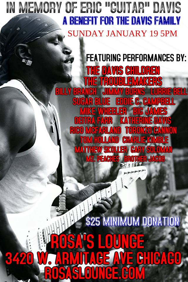 - RIP Eric “Guitar” Davis – March 19, 1972 to December 19, 2013. The hardest part of writing a newsletter is reporting the tragic, untimely death of a youthful bright light of the blues. Guitarist, vocalist Eric “Guitar” Davis was young, talented, charismatic and destined for greatness. He was found shot to death in Chicago the week before Christmas. This created a deep sadness throughout the Chicago blues community and beyond. Eric was the son of renown Chicago blues drummer Bobby “Top Hat” Davis, who bestowed the lessons of the blues on all his children. Likewise, Eric, who at 41 years old had 6 children (3 of his own and 3 stepchildren by his wife Leslie), taught his kids to play blues and was taking them around to local jam sessions. His CD Trouble Makin’ Man will serve as his recorded legacy. Everyone in Chicago knew, liked, and respected this young man. We all had great hopes for him and his passing weighs heavily on the psyche of the blues world. Rosa’s Lounge in Chicago is coordinating a January 19th fundraiser to cover funeral costs and help Eric’s family (to see the flyer click here). To read more about Eric “Guitar” Davis’ passing, click here for the Huffington Post article.