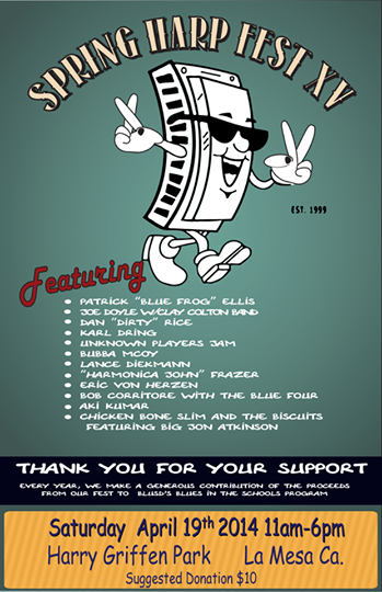 Friday: Morry Sochat & The Special 20s with guests Billy Watson and Bob Corritore at The Rhythm Room in Phoenix. To see the event flier click here.Saturday afternoon: The Spring Harp Festival in San Diego! This simply amazing annual event aimed at providing harmonica lessons to children features a power list of great Southwestern based harmonica players: Aki Kumar,Karl Dring, Harmonica John Frazer, Chicken Bone Slim with Jon Atkinson, Bubba McCoy, Patrick “Blue Frog” Ellis, Lance Dieckmann, Eric VonHerzen, Joe Doyle with Clay Colton, Dan “Dirty” Rice, an “Unkown” harmonica players jam, and Bob Corritore with the Blue Four! Bob’s set is around 3pm. To see the event flier click here.Saturday night: Tomcat Courtney‘s show and maybe sitting in a few.Sunday morning: Playing for the homeless Easter morning with Jessi Colter, Ray Herndon, Dave Riley and others at Vincent De Paul Homeless Shelter in Phoenix from 10:30am to noon.Sunday afternoon: Appearing at Mona’s Going Away Party at The Rhythm Room with Nina Curri and George Bowman. We say goodbye to Mona Watkins, GM of the Rhythm Room, as she starts a new chapter of her life after 17 years of amazing service to the community. Anyone who has every stepped foot in the Rhythm Room knows Mona, who has always been there for everyone. She gets to move on to a more sane schedule and actually have a life outside of work. We will miss her greatly, and her contributions are immeasurable. To see the event flier click here.Sunday night: Bob hosts his weekly blues radio program “Those Lowdown Blues” from 6pm to 11pm Standard Mountain Time. You can tune in online at KJZZ.org, or if in Phoenix, at 91.5FM. -