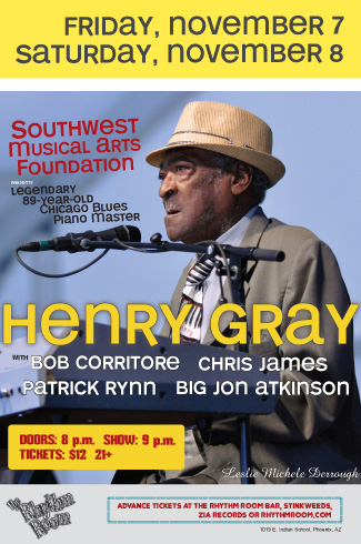 - Henry Gray to celebrate his 90th birthday with celebrations in Tucson and Phoenix! Blues piano legend Henry Gray‘s long history in the blues includes classic recordings with Howlin’ Wolf,Little Walter, Jimmy Reed, Jimmy Rogers, Billy Boy Arnold and many more. Still active and in great form Henry continues to dazzle with his elegant blues piano and strong heartfelt vocals. Henry was born on January 19th, 1925 and to celebrate he will come to Arizona, a state which has shown great support for Henry’s music, for 2 special birthday shows. Henry will appear January 16th at the Boondocks in Tucson (promoted by KXCI‘s Marty Kool) and January 17th at The Rhythm Room in Phoenix. Backing Henry for these shows are Bob Corritore on harmonica, Big Jon Atkinsonon guitar, Troy Sandow on bass and Brian Fahey on drums.