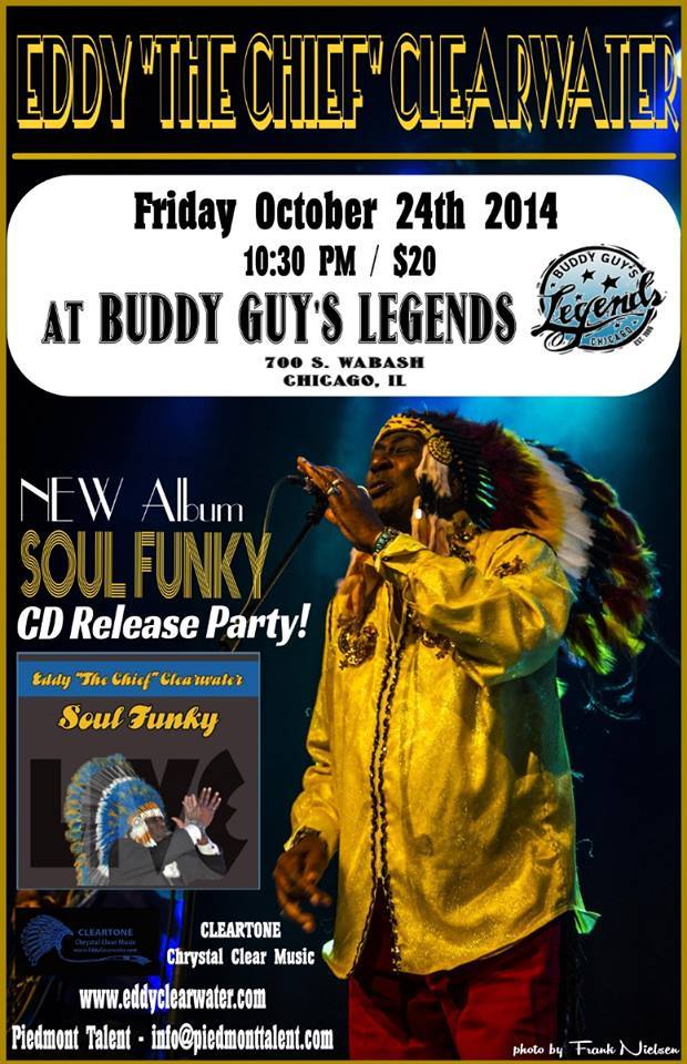 Eddy Clearwater CD Release Party This Friday at Legends! World renown blues artist Eddy “The Chief” Clearwater celebrates the release of his new CD Soul Funky on October 24th at Buddy Guy’s Legends In Chicago. For more information on this CD click here, and to see the flyer for this event click here. Thanks to Lynn Orman and Amy Brat for getting the word out!