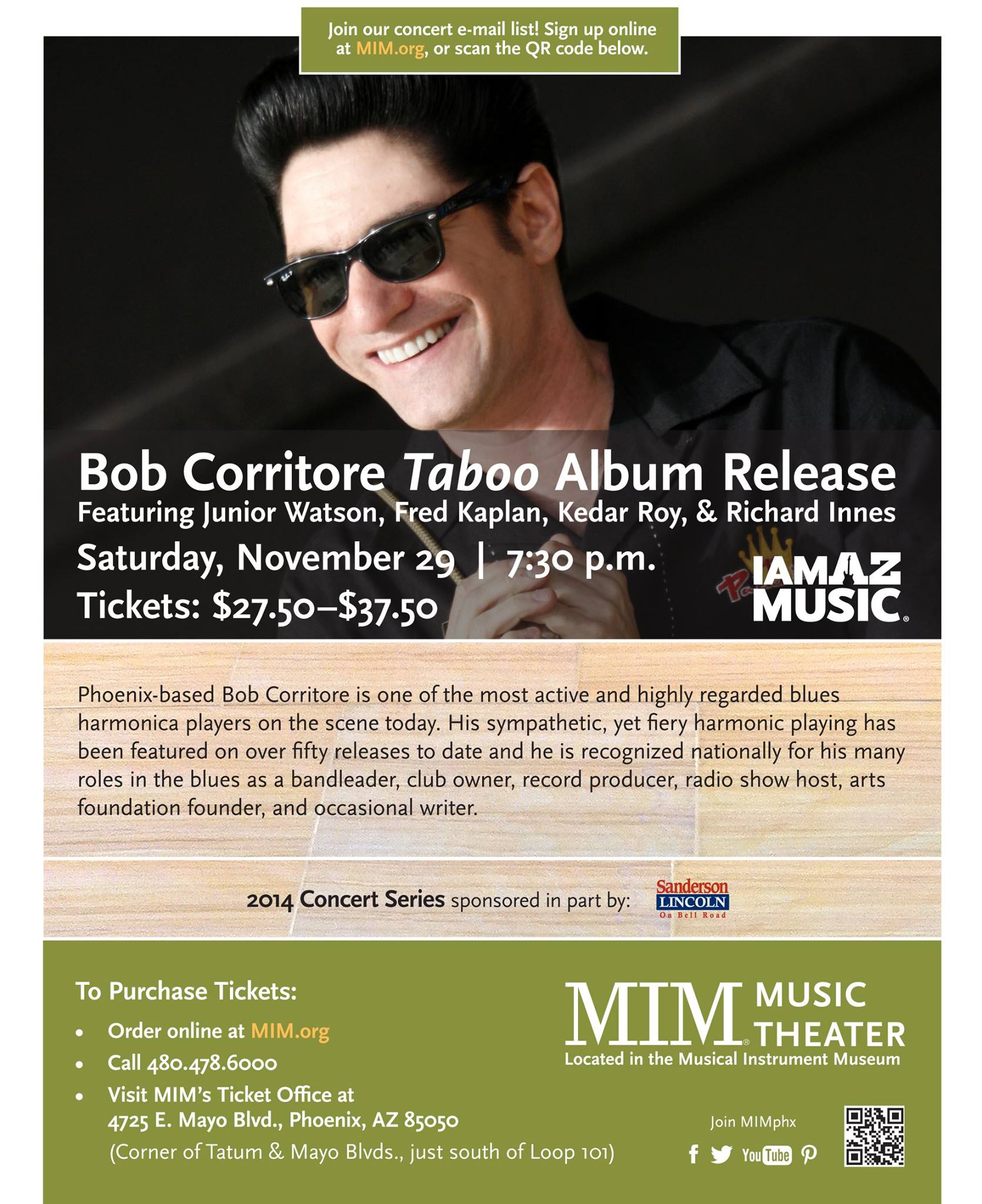 - CD Release Party For Taboo Tomorrow Night at MIM! Come celebrate Bob Corritore‘s latest CD Taboo with the brilliant core band from the album at the MIM on Saturday, November 29th. Appearing at this milestone event are Bob Corritore with Junior Watson, Fred Kaplan, Kedar Roy, and Richard Innes. The MIM Music Theatre is a simply amazing performance arts venue and the perfect place to highlight the subtleties of this show. Good seats are still available for this event here. To see the flyer for event click here.