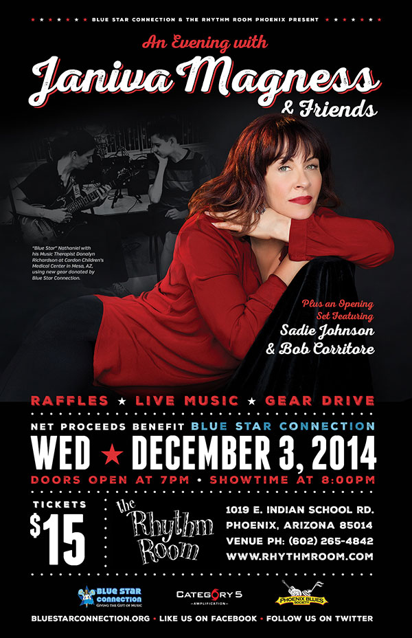 - Janiva Magness at The Rhythm Room on December 3rd! The Blue Star Connection comes to Phoenix on Wednesday, December 3rd for a show at the Rhythm Room featuring the amazing Janiva Magness.There will be an opening set by 17 year old Sadie Johnson, accompanied by Bob Corritore. The Blue Star Connection, headed by John Catt, has this as their mission statement:”Our mission is to provide access and ownership of musical instruments for children and young adults with cancer and other serious challenges. We also provide music therapy departments with instruments.”For more information on this event click here. To learn more about Blue Star, go to BlueStarConnection.org.