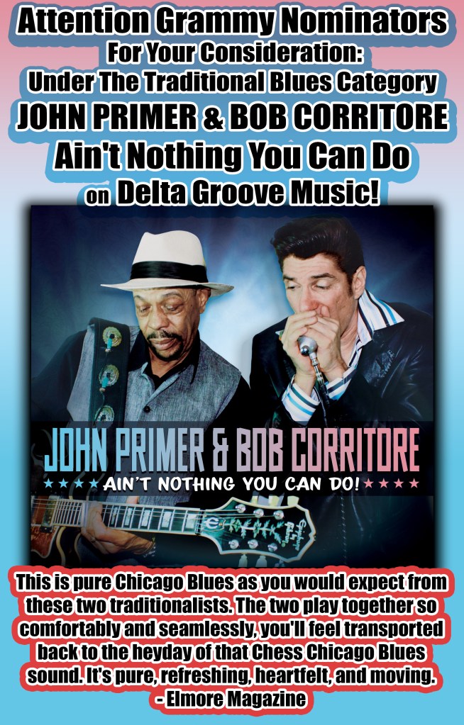 We are delighted that Big Jon Atkinson & Bob Corritore / House Party At Big Jon’s (Delta Groove Music) and John Primer & Bob Corritore / Ain’t Nothing You Can Do (Delta Groove Music) are both up for Traditional Blues Album! What an honor to have not just one, but two releases recognized!