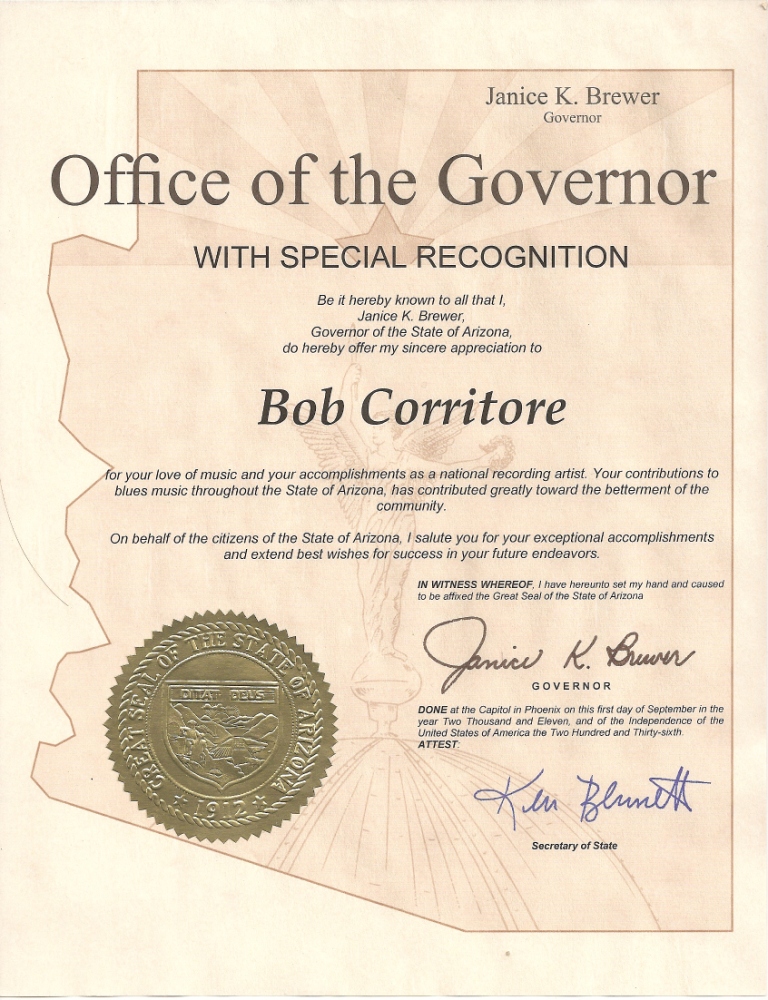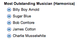 In addition to Bob Corritore & Friends / Harmonica Blues winning a Blues Music Award for “Historic Album”, Bob also received a BMA nomination under the “Instrumentalist – Harmonica” category. Also nominated were James Cotton, Kim Wilson, Paul Oscher, and Charlie Musselwhite. It was Charlie who would walk away with the win! Here is the lovely nomination certificate.