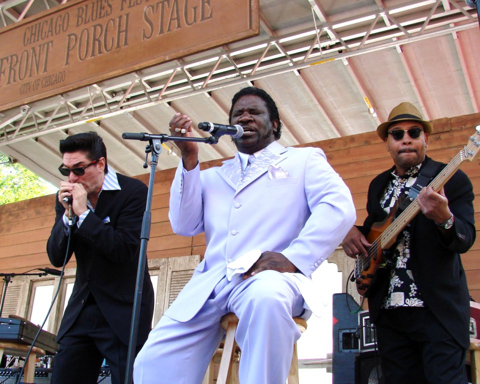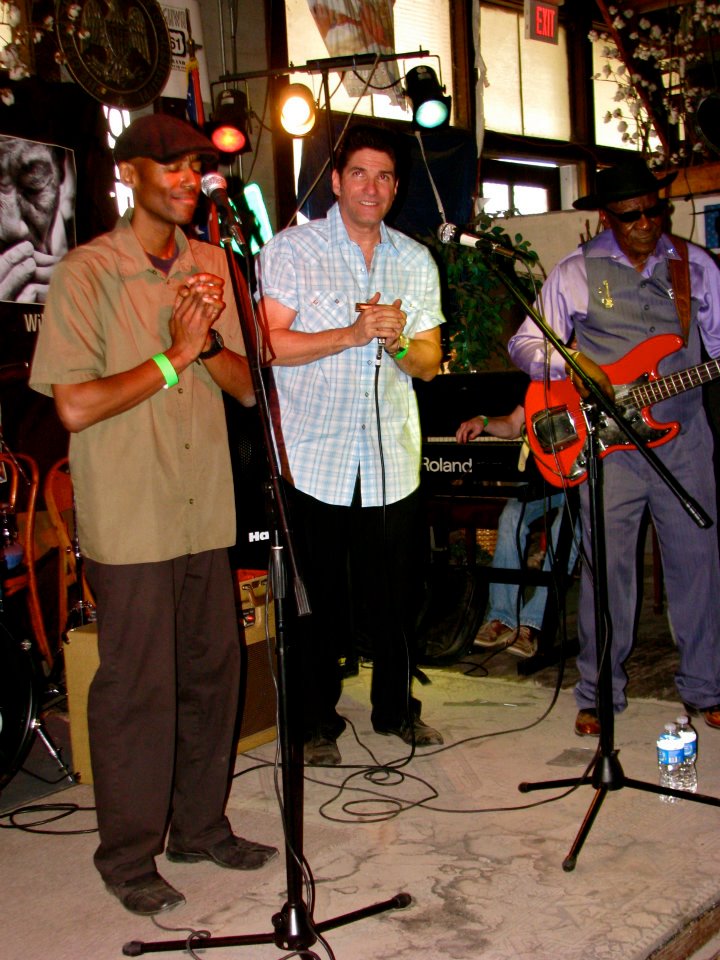Bob Corritore appearing with The Mud Morganfield Band on Sunday, June 12 at the Front Porch Stage at the Chicago Blues Festival. A spectacular performance with an all-star band. Pictured are Bob Corritore, Mud Morganfield, and E.G McDaniel. Also in the band were Kenny Smith, Barrelhouse Chuck, Billy Fynn, Rick Kreher, and Harmonica Hines, who split the harp chores with Bob.