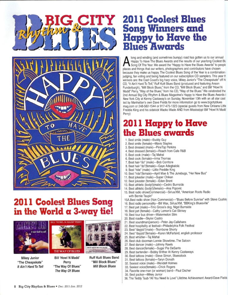 In December of 2011, Big City Blues Magazine gave Bob Corritore a “Happy To Have The Blues” Award for Best Hair-Do (male)!
