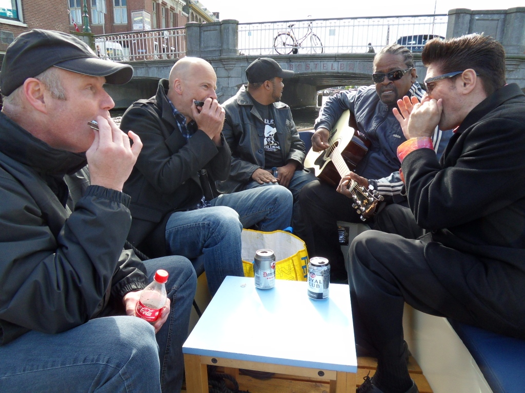 George Reijnders, Vincent van Wijk, Dave Riley Jr, Dave Riley, Bob Corritore in Leiden, Holland Playing the Blues on a Boat on the Rhine River