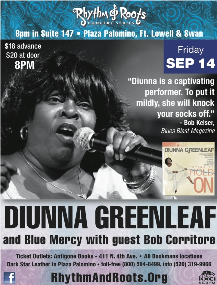 Diunna Greenleaf and Blue Mercy performed in Tucson with guest Bob Corritore in Tucson, AZ on Friday, September 14th as part of Susan Holden’s Rhythm & Roots Series.