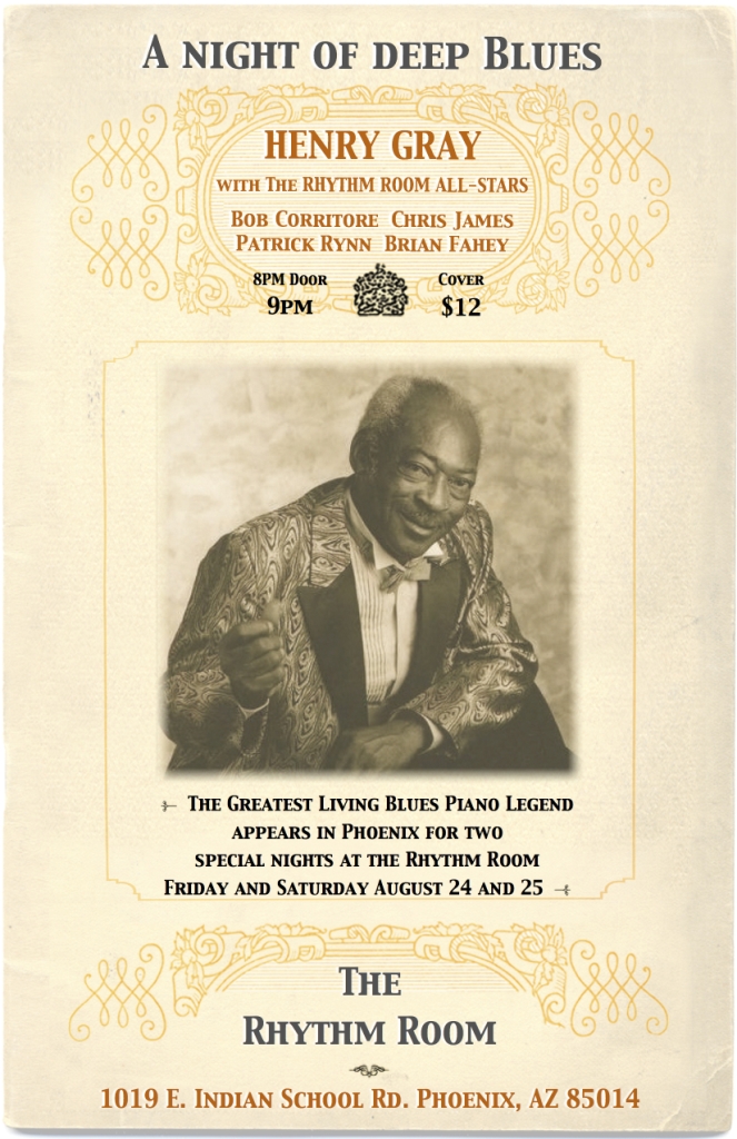 Henry Gray, Bob Corritore, Tail Dragger at The Rhythm Room – October 13th
