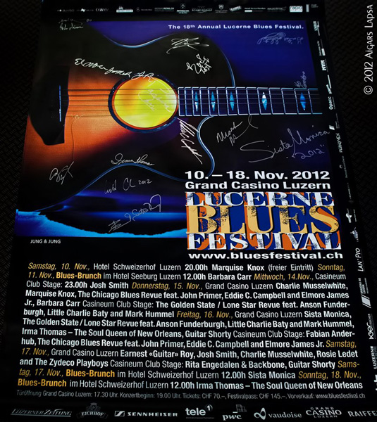 The Lucerne Blues Festival happened on November 15th, 16th, 17th & 18th with pre-events before that. Bob Corritore organized an amazing Chicago Blues Revue for the festival with Eddie C. Campbell, Elmore James Junior, John Primer, Bob Stroger, Billy Flynn, Barrelhouse Chuck, Kenny “Beedy Eyes” Smith, and of course Bob on harmonica! Here is the festival poster!
