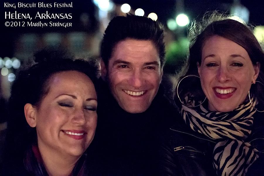 Julia Magness, Bob Corritore, and Cleome Bova on a chilly night at the King Biscuit Blues Festival in Helena, AR – October 5th