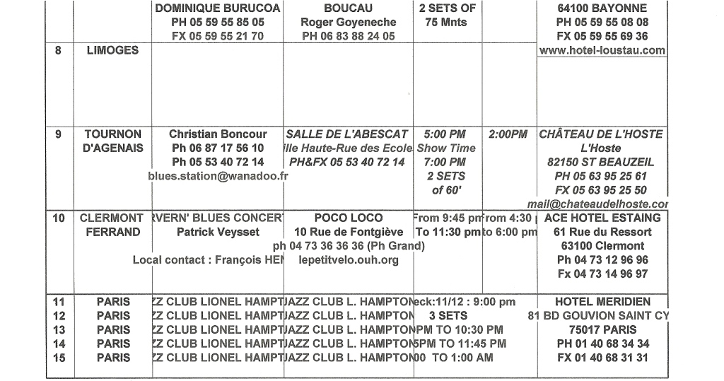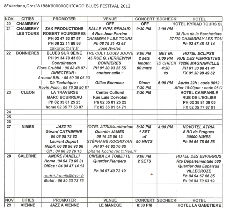 After the Lucerne Blues Festival, Bob Corritore, John Primer, and Billy Flynn joined forces with Peaches Staten, Willie Hayes, and band leader Melvin Smith for the month long, 2012 Chicago Blues Festival Tour. This tour is legendary and has been an annual event in Europe since 1970. We hit venues in France, Belgium, Luxembourg, Spain, and Holland on this tour, and played to packed houses each night! Here is the fantastic itinerary, though it did change slightly (one date was added and another dropped). We will just touch upon this tour in this “Year In Review” photo page, because we will have a whole photo page dedicated to this tour forthcoming!