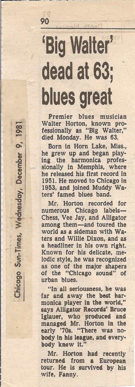 Big Walter Horton Obituary (Courtesy of Illinois Slim)