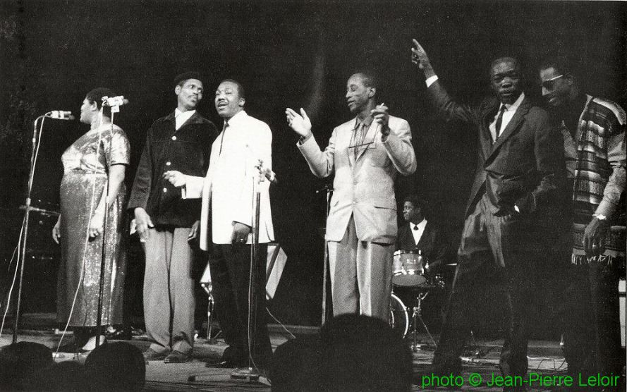 L-R: Mississippi Fred McDowell, John Lee Hooker, Doctor Ross, J.B. Lenoir, Big Walter Horton, Big Mama Thornton, Paris, 1965. Photo Jean-Pierre Tahmazian.