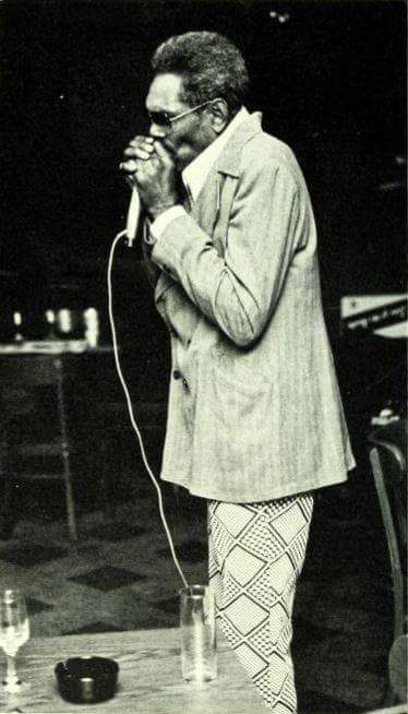 Big Walter Horton sitting in with Muddy Waters Band. That’s Muddy in the background. Photo by D. Shigley.