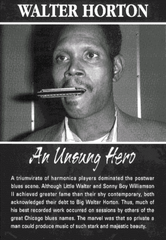 Big Walter Horton was one of the greatest harmonica stylists of all time, and a true master of Chicago blues. He possessed an unbelievable sound that stood out above all other players, that incorporated a chilling vibrato, combined with swooping phrases and a bell-like tonality. Though a fine singer, his role on many recordings was that of an accompanist. Many of the recordings that included his harmonica are true classics, such as Jimmy Rogers’ Walkin’ By Myself, Muddy Waters’ She’s All Right, Johnny Shines’ Evening Sun, and Tommy Brown’s Southern Woman. Growing up in Chicago, Bob was blessed to know Big Walter Horton and to see hundreds of his performances. Please enjoy this collection of rare photos of a true champion of blues harmonica.