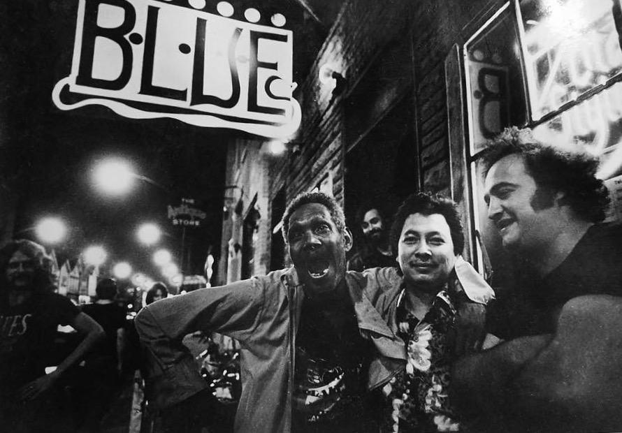 Jim Themelis, Big Walter Horton, Joe Berson (in back), Rich Molena, John Belushi outside of BLUES, Chicago. Belushi was in town filming The Blues Brothers movie.