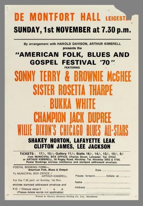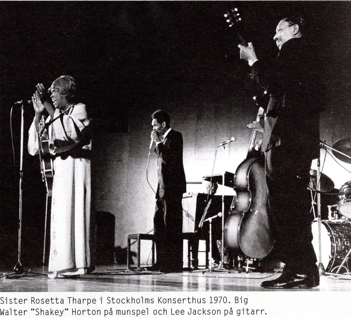 Sister Rosetta Tharpe, Big Walter Horton, Lee Jackson. Obscured in the background are Clifton James behind the drums and Willie Dixon on the bass. 1970.