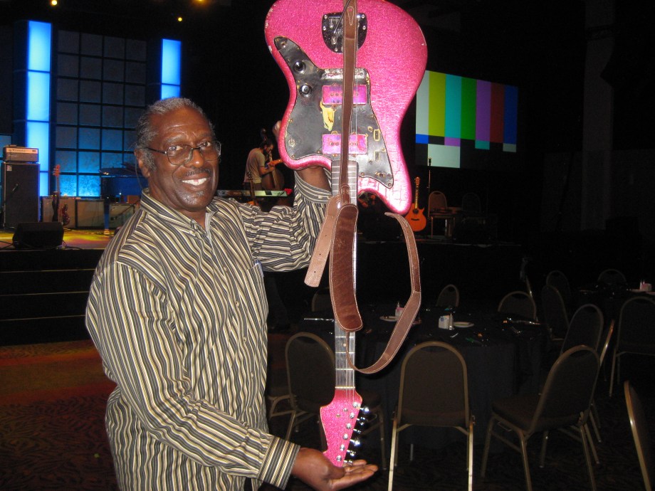 Eddie C. Campbell having fun with his guitar at soundcheck – this day was also Eddie’s Birthday! (Photo by Bob Corritore)