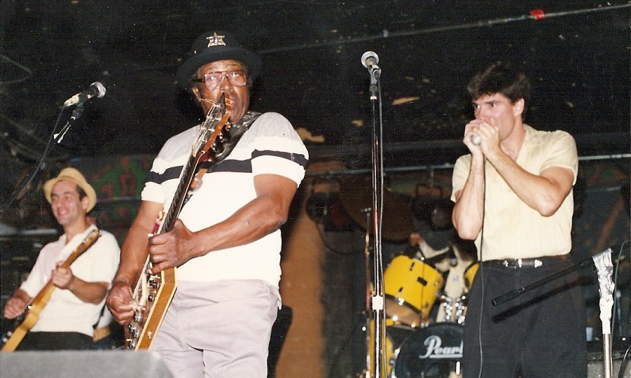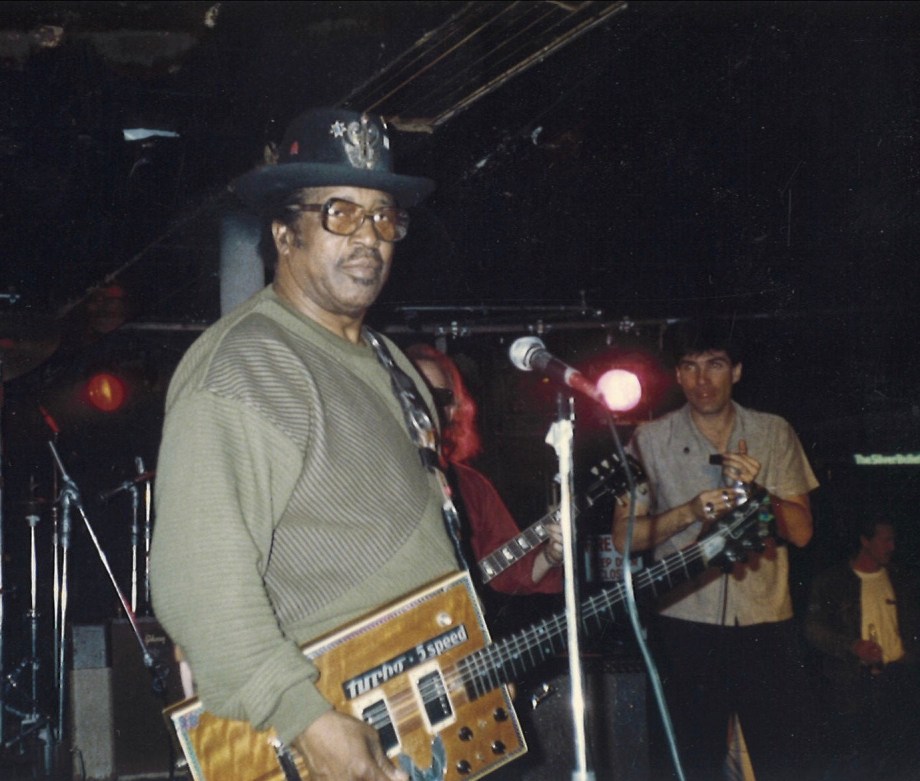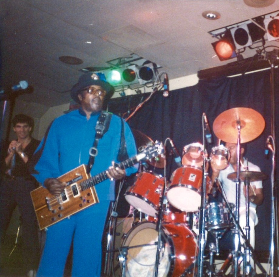 Bo Diddley in concert at the Pony Express, Phoenix, mid-1980s with Bob Corritore (left) and Jerome Teasley (drums on right).