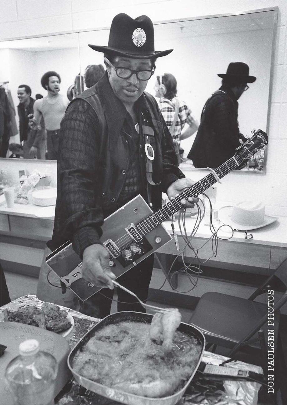 Bo Diddley frying chicken in the dressing room before a concert in 1972. Photo Don Paulsen.