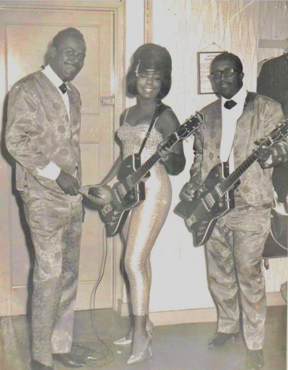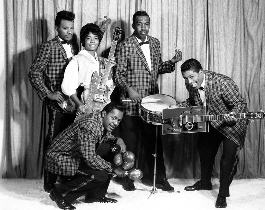 The Bo Diddley Band with Little Richard shaking the tambourine. This from a 1963 U.K. package tour.