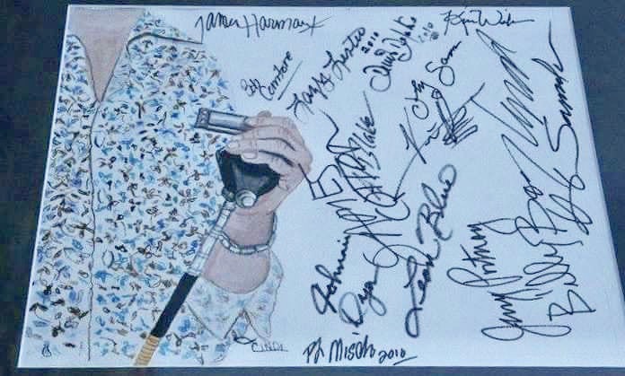 This amazing painting of my harmonica hand was done by the Cindi Bernhardt. This was on display in 2010 at the Amanda’s Roller Coaster harmonica show. Thus the great autographs! Cindi does not have use of her arms, and has been able to overcome that obstacle by holding a paintbrush in her mouth. That makes this painting even more incredible. Love you Cindi!