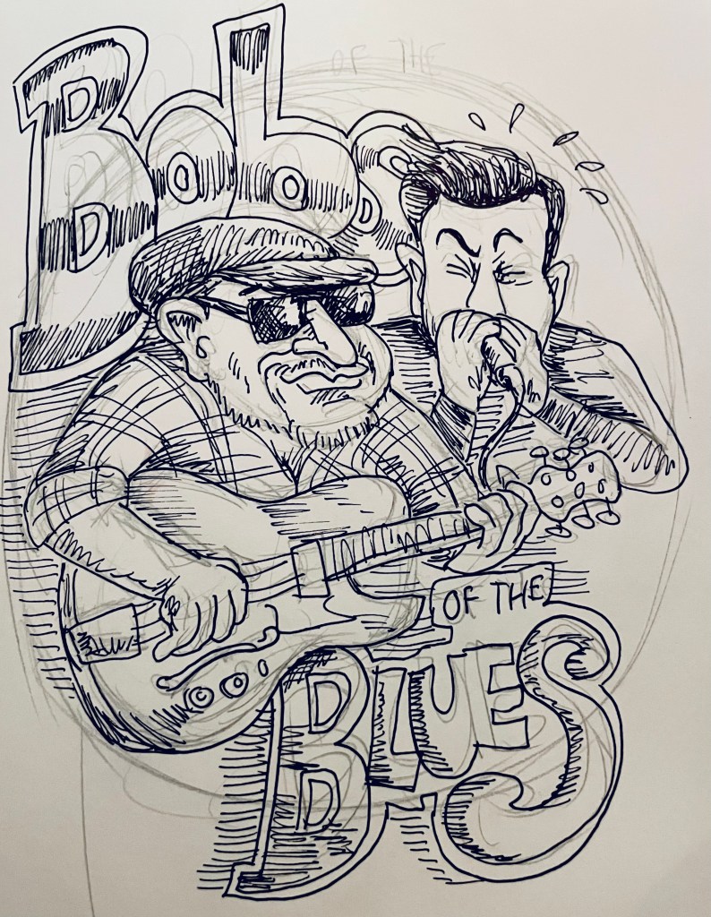 Caricature sketch of Bob Margolin and Bob Corritore done in Bern, Switzerland by Crazy David.