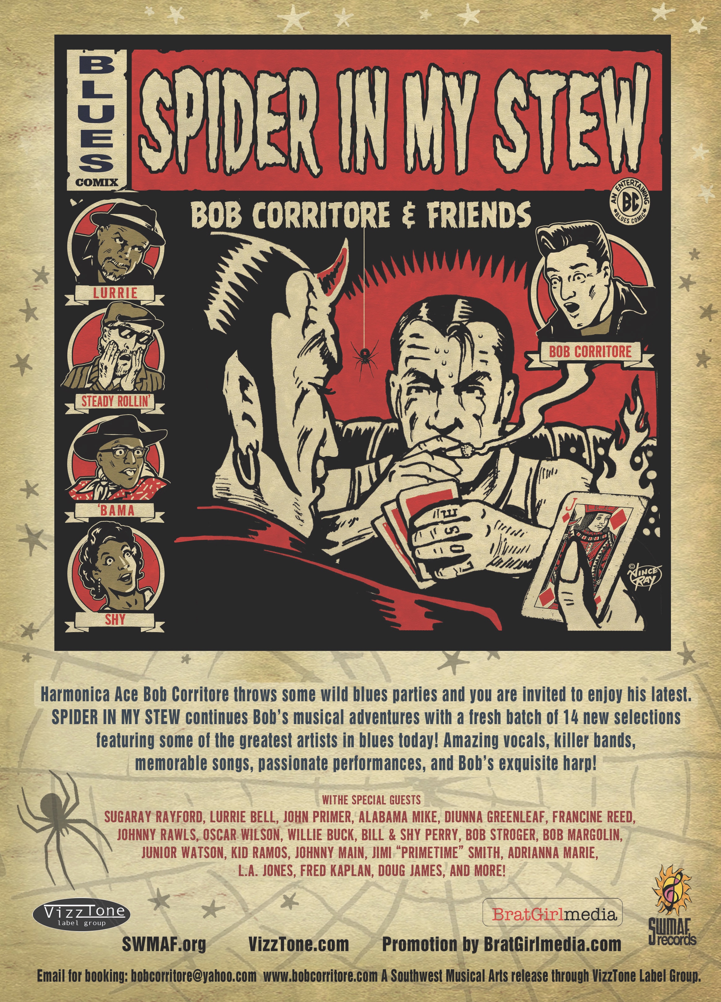 Bob Corritore & Friends – Spider In My Stew CD Art Brilliant CD art by illustrator Vince Ray! 2021 Release Next photo pagePrevious photo page Back to photo index Share this: Click to share on X (Opens in new window) X Click to share on Facebook (Opens in new window) Facebook Like Loading...