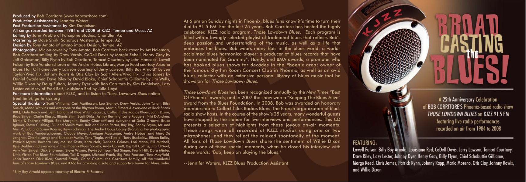 Broadcasting The Blues CD Artwork This CD will commemorate the 25 year anniversary of Those Lowdown Blues with recordings of some of the great historic live on-air performances heard on the show. Cover artwork is courtesy of Tony Amato of Amato Image Design. Front Cover Gatefold 1 Gatefold 2 Back Cover Tray Outside CD Face Next photo page Previous photo page Back to photo index Share this: Click to share on X (Opens in new window) X Click to share on Facebook (Opens in new window) Facebook Like Loading...