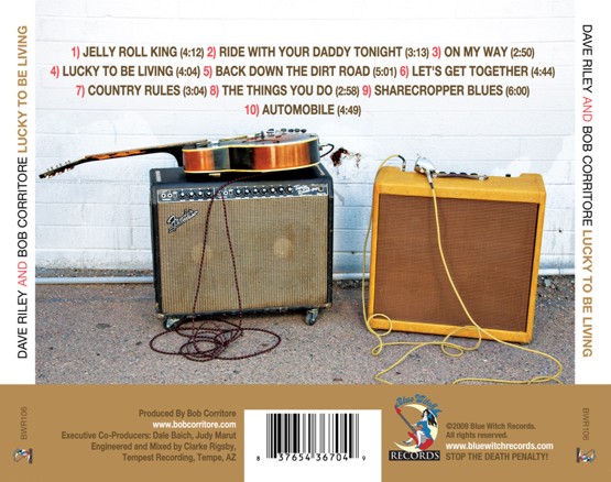 Dave Riley and Bob Corritore’s second release is called Lucky To Be Living and will be released on the Blue Witch record label on Sept 8, 2009. The title track is one of 4 Frank Frost songs covered on the album. This is appropriate in that Dave Riley worked in the late Frank Frost’s band, The Jelly Roll Kings, as a replacement for Big Jack Johnson, who had left the group to launch his own career. Dave and Bob’s partnership has been celebrated around the world, and this highly-anticipated follow-up to Travelin The Dirt Road answers the call. Album graphics courtesy Tony Amato of Amato Image Design.