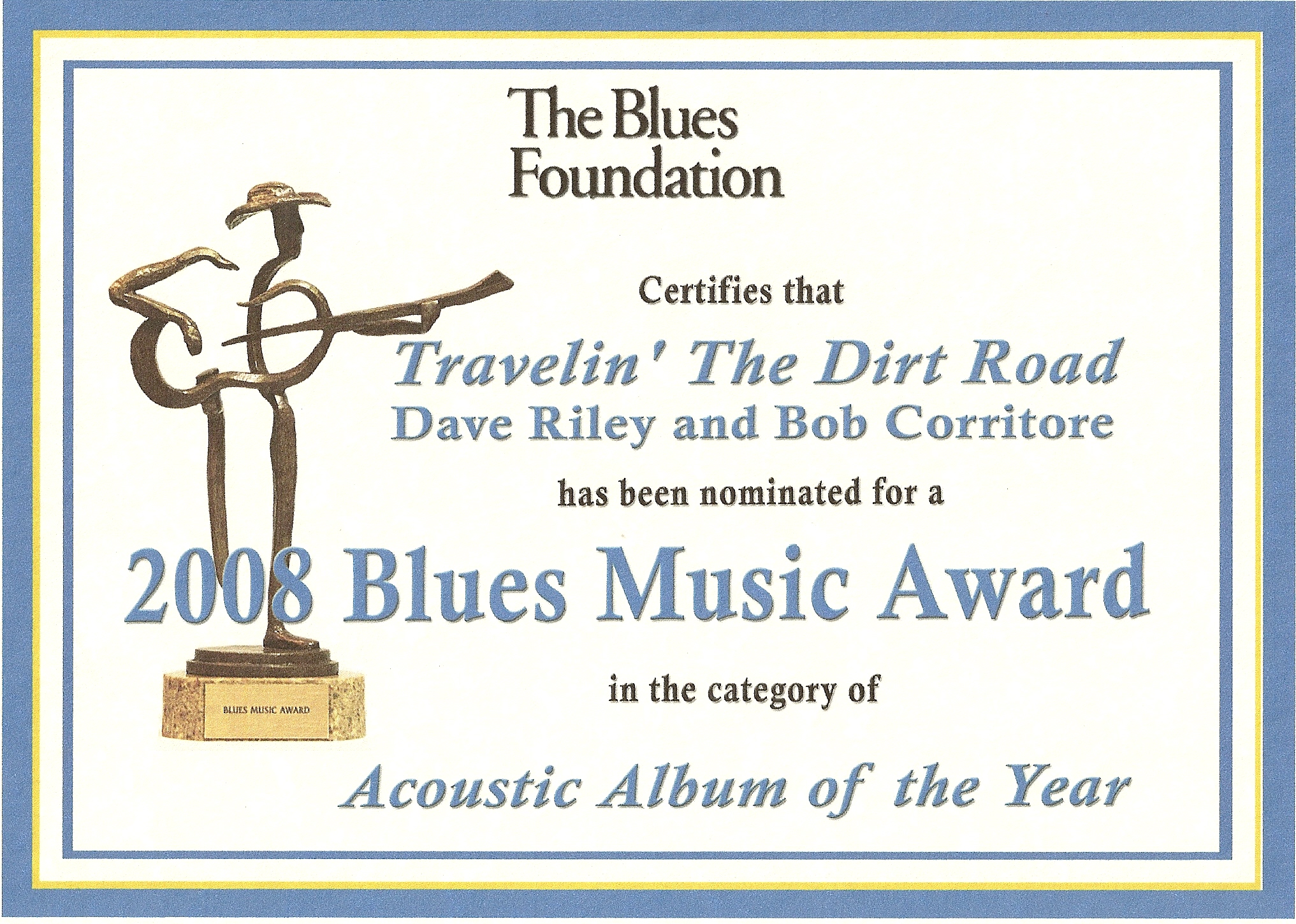 Dave Riley & Bob Corritore’s BMA Nomination Certificate