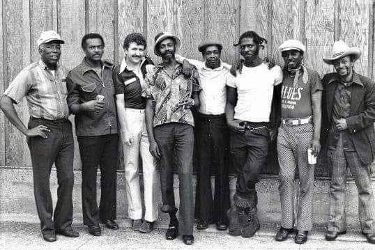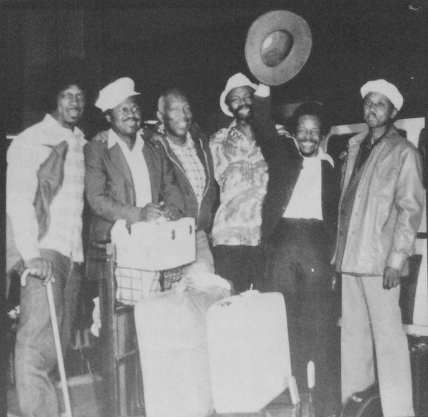 Heathrow Airport, October 1, 1979 L-R: Eddie C. Campbell, Nolan Struck, Billy “The Kid” Emerson, Lester Davenport, Chico Chism, Good Rockin’ Charles. Photo courtesy Lex Jansen.