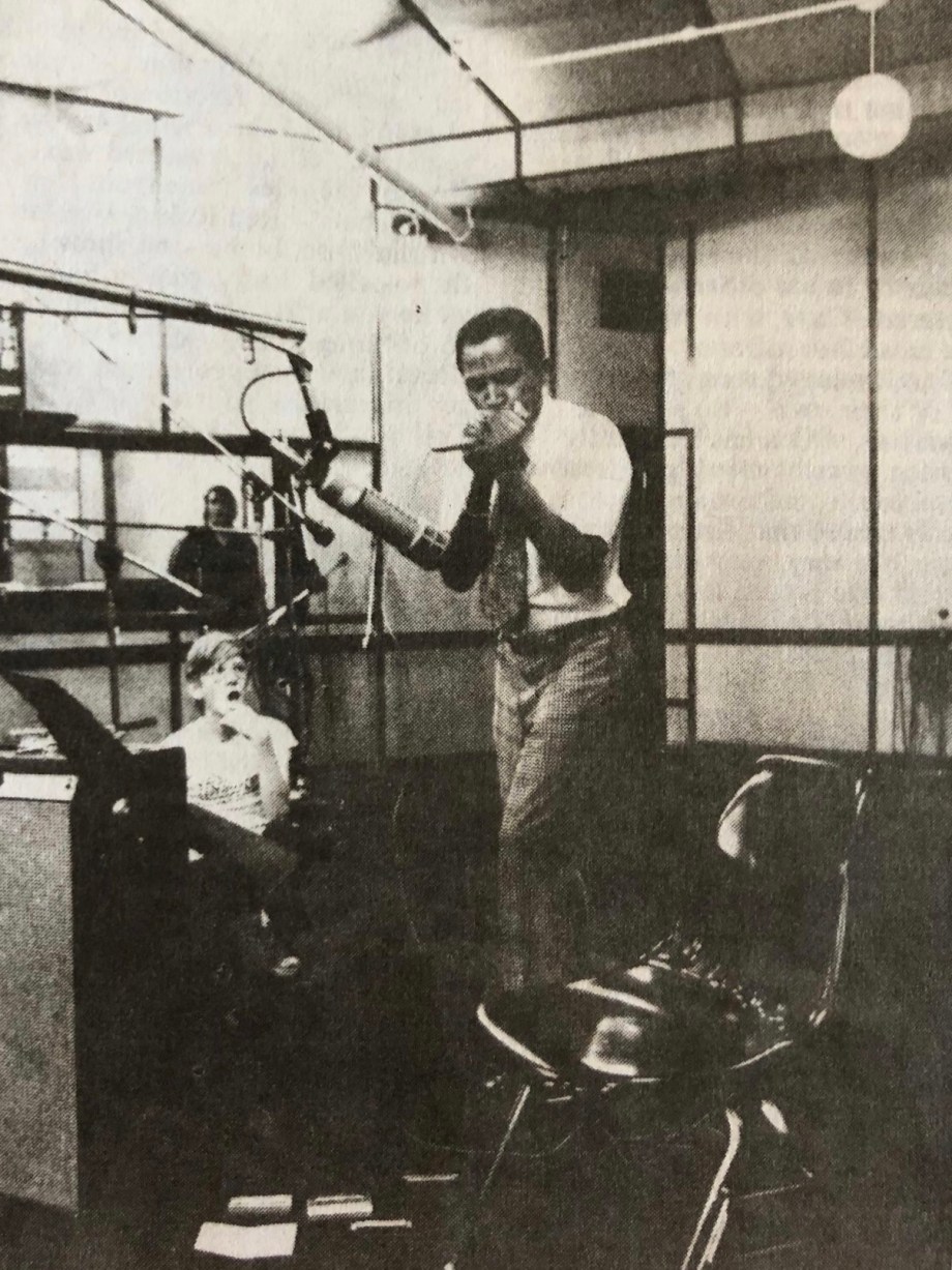 This photo was taken at the recording session for the American Blues Legends 1979 album. This album was recorded prior to the European tour of the same name. Left to right are Billy “The Kid” Emerson, Jimmy Dawkins, Jim Simpson (owner of Big Bear Records and tour organizer), Lester Davenport, Nolan Struck, Little Smokey Smothers, Eddie C. Campbell, Good Rockin’ Charles, Chico Chism.