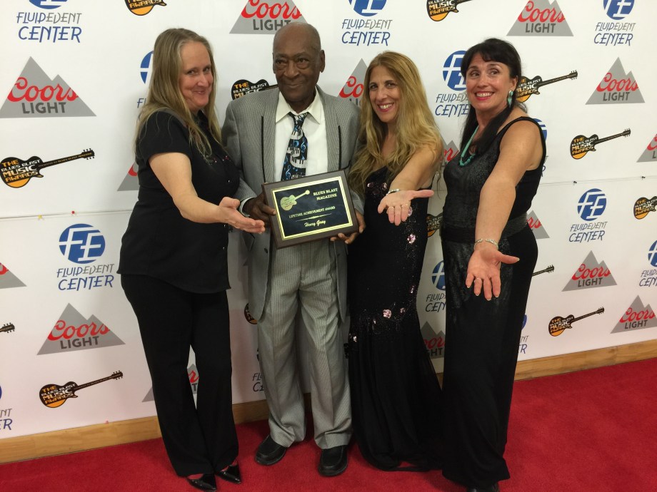 Henry Gray received a Blues Blast Lifetime Achievement Award at the 2015 Blues Blast Music Awards. Here is Henry in his moment, adoringly surrounded by Fiona Boyes, Lynn Orman, and Linda Cain! Photo Bob Corritore.