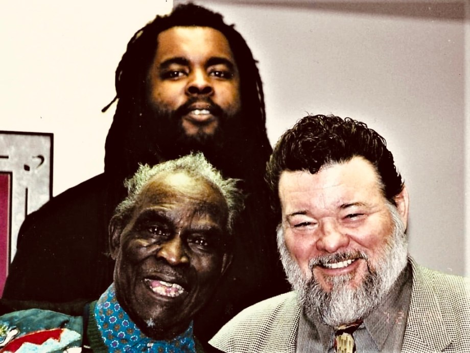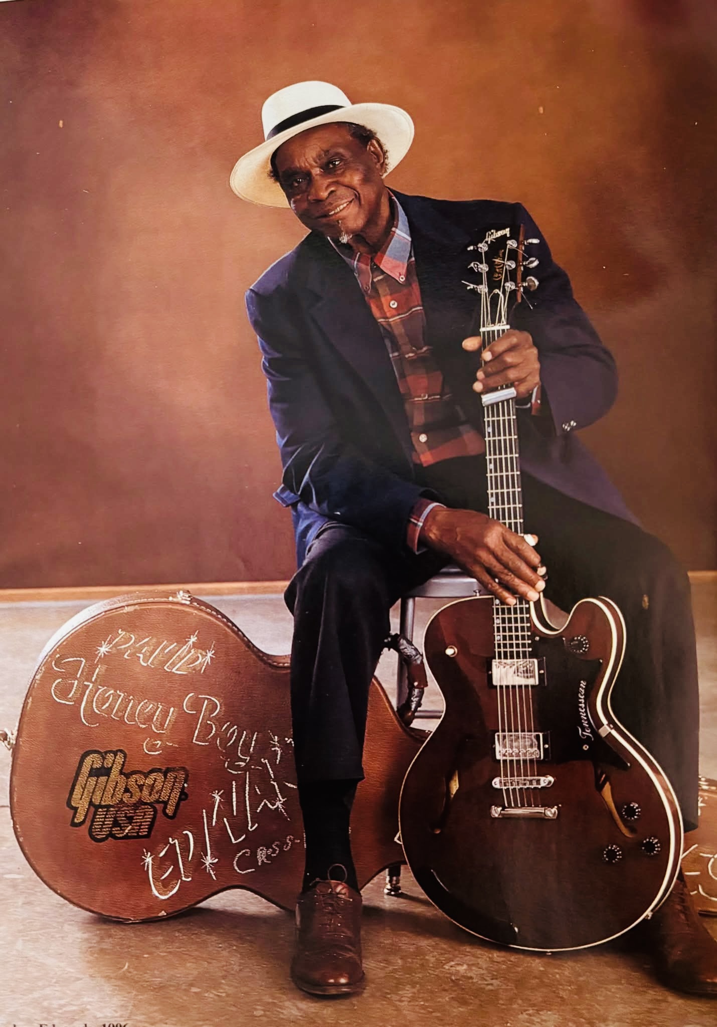 Honeyboy Edwards with Alvin “Youngblood” Hart and James Harman. Photo courtesy James Harman.