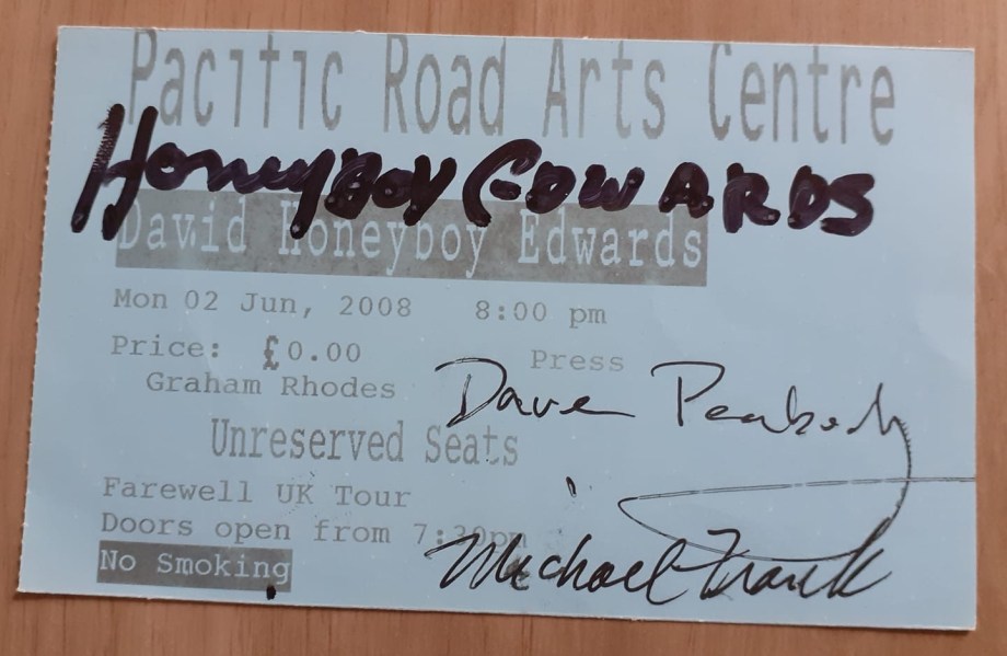 Autographed ticket stub from Pacific Road Arts Center, Birkenhead, England show. Ticket courtesy Graham Rhodes.