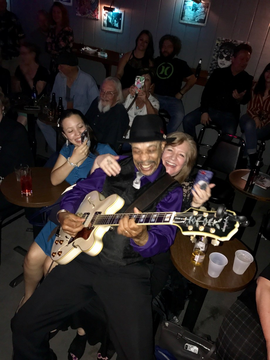 John Primer entertains the Rhythm Room with daughter Aliya and wife Lisa in 2019! Photo from the stage by Bob Corritore.