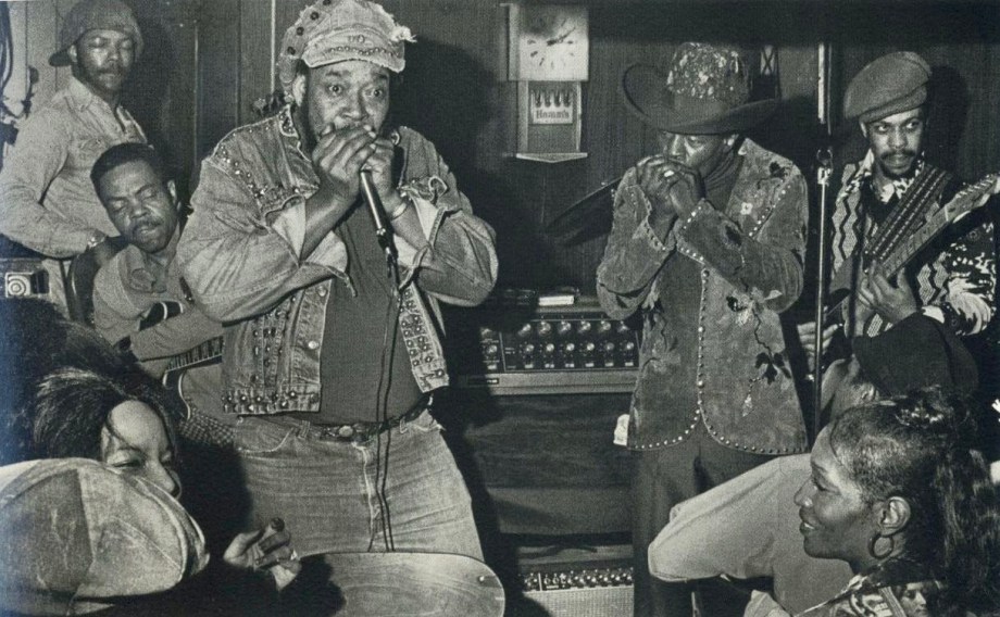 Charles Camese, Sammy Lawhorn, James Cotton, Junior Wells, John Primer at Theresa’s Lounge. Photo by Marc PoKempner.