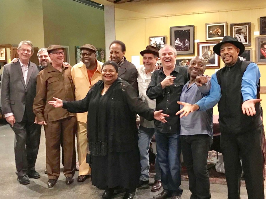 Mark Hummel put together a Chicago blues extravaganza tour in 2018 with (L-R) Billy Flynn, Bob Welsh, Mark Hummel, Oscar Wilson, Deitra Farr, Billy Boy Arnold, R.W. Grigsby, R.J. Mischo, June Core, and John Primer.