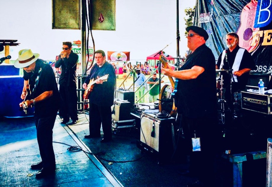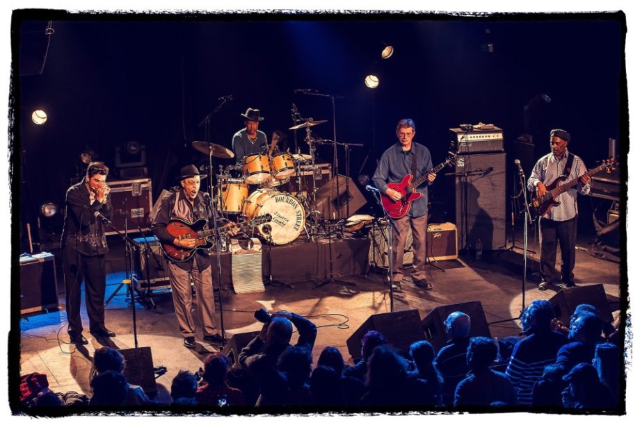 Blues super-group at the 2012 Lucerne Blues Festival: Barrelhouse Chuck, Elmore James, Jr., Bob Corritore, Bob Stroger, Billy Flynn, John Primer. Photo by Art Tipaldi.