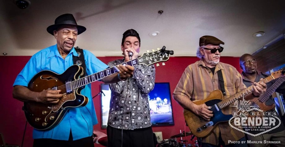 John Primer, Bob Corritore, Bob Margolin, Russell Jackson at the 2018 Big Blues Bender. Photo by Marilyn Stringer.